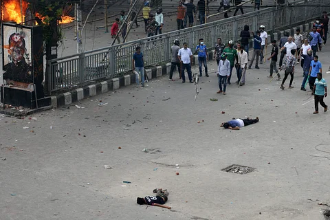 রাজধানীর উত্তরার আজমপুরে আওয়ামী লীগ ও বিক্ষোভকারীদের মধ্যে সংঘর্ষের একপর্যায়ে এভাবে দুজনকে রাস্তায় পড়ে থাকতে দেখা যায়। আজ রোববার দুপুরে। এখানে সংঘর্ষে ২২ জন গুলিবিদ্ধ হয়েছেন